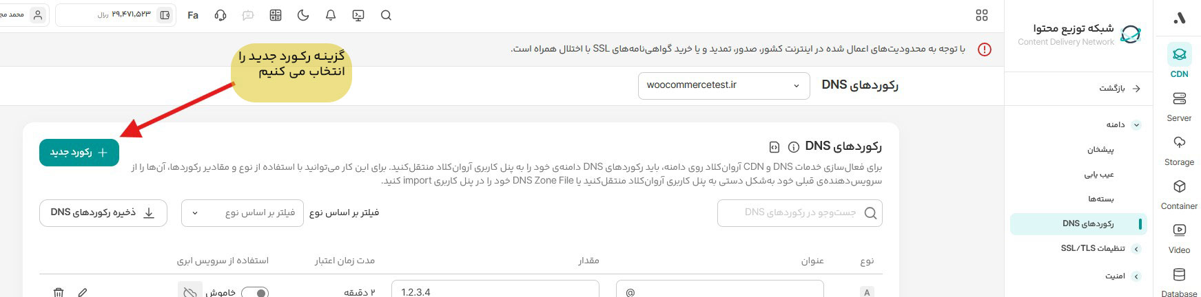 روی دکمه «+ رکورد جدید» کلیک میکنیم تا یک رکورد DNS تازه بسازیم.