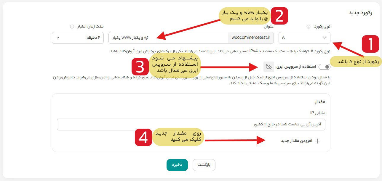 @را برای دامنه اصلی وارد میکنیم (سپس یک رکورد جداگانه باwwwایجاد میکنیم) - گزینه استفاده از آدرس ابری: غیرفعال
