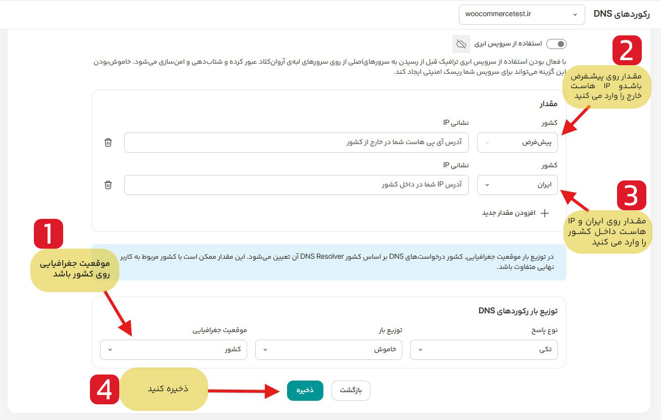 - موقعیت جغرافیایی را روی گزینه کشور قرار می دهیم (این یعنی DNS بر اساس کشور کاربر پاسخ میدهد)