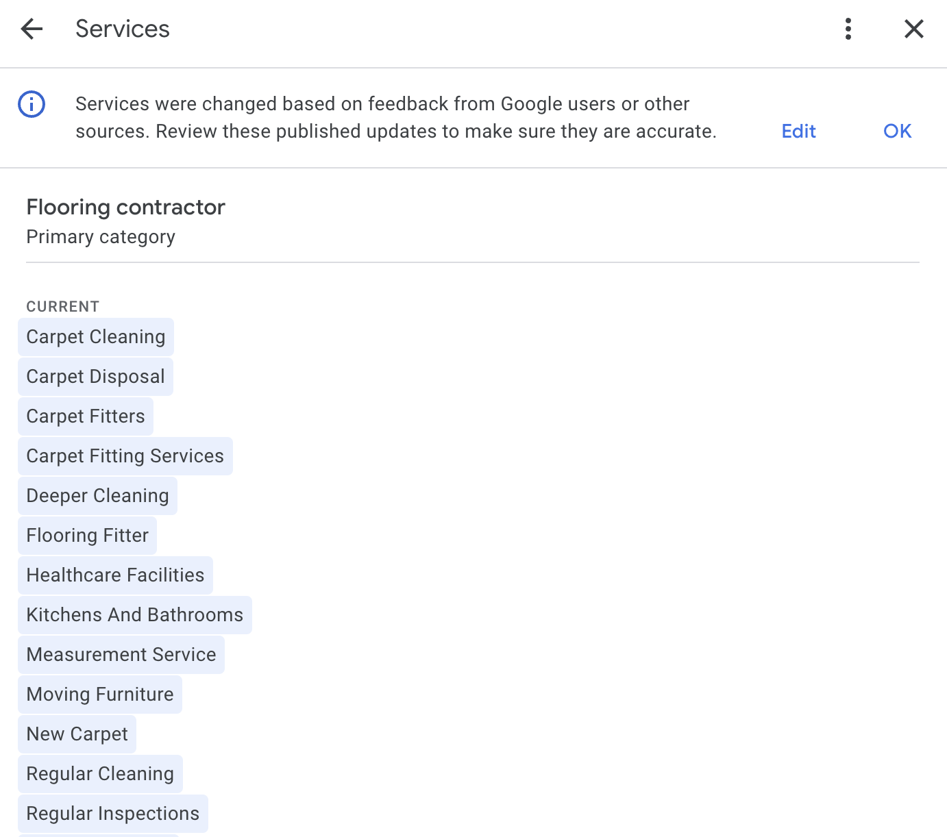 Importantly, Google will automatically change parts of your GBP listing (like the services you offer) based on reviews, so it’s important to monitor which changes Google has made.