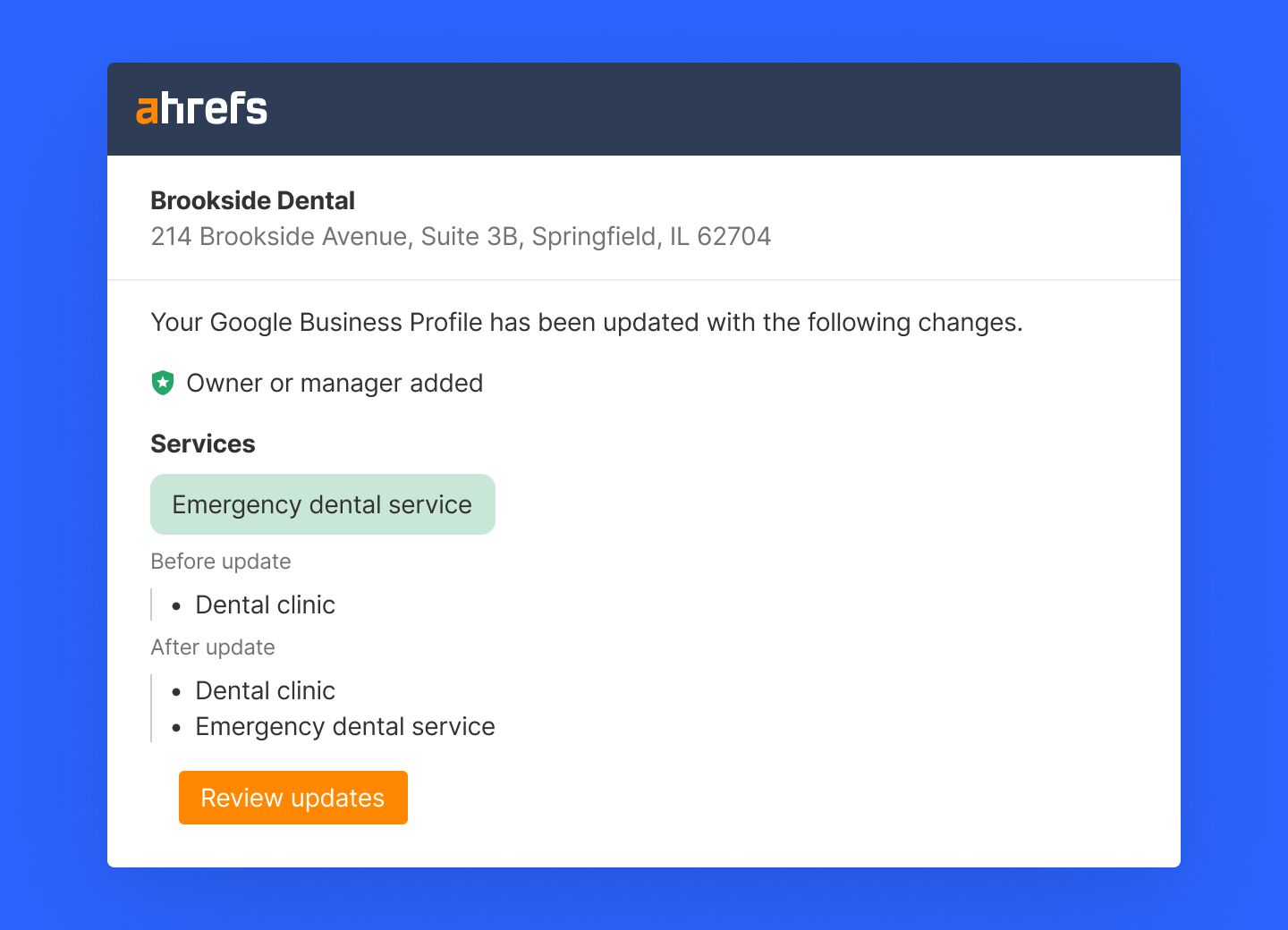 That’s where Ahrefs’ Google Business Profile Monitor comes in. It helps you catch unauthorized changes, reject malicious edits, and manage multiple profiles efficiently from a single dashboard. You’ll receive real-time email alerts for any change, whether it’s made by you, your team, or Google, and you can bulk edit fields like business hours, categories, and contact details.