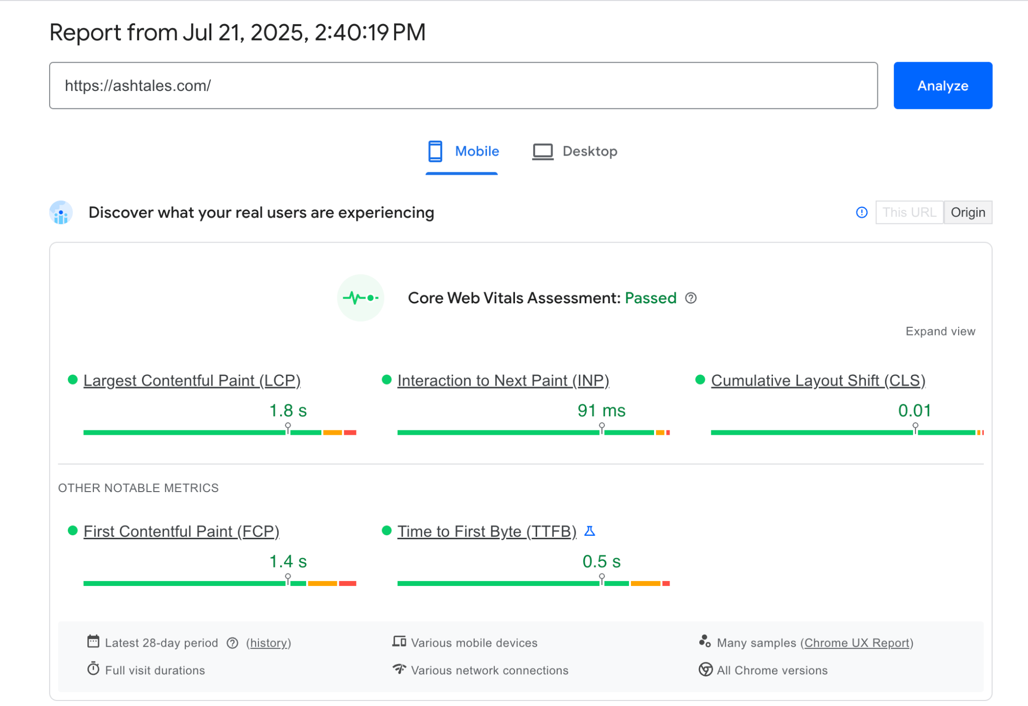 What sets PageSpeed Insights apart is that it pulls in real-world field data from the Chrome UX Report (CrUX), showing how your site performs for actual users on different devices and network conditions—not just lab simulations.