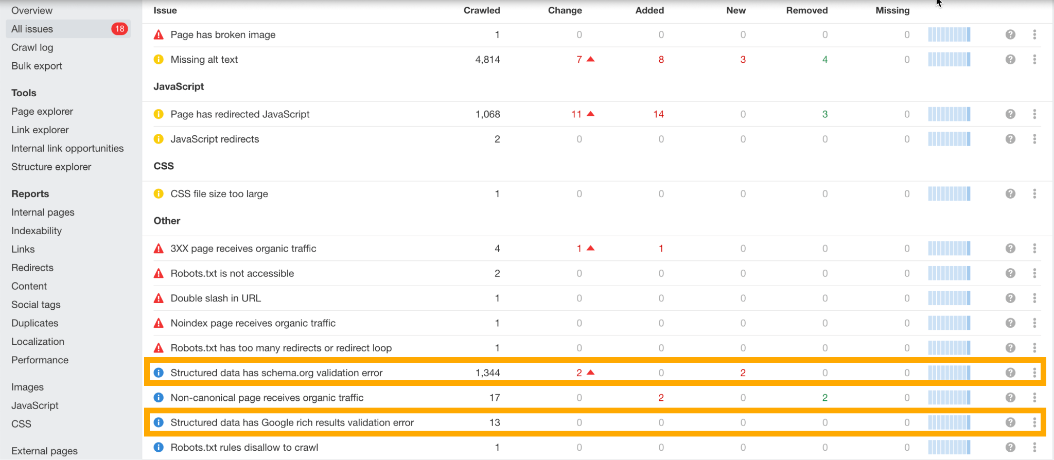To go beyond individual URL checks, Ahrefs’ Site Audit lets you flag any pages with structured data issues. This feature crawls your entire website and flags problems at scale—like missing fields, invalid schema types, or unsupported rich result types.