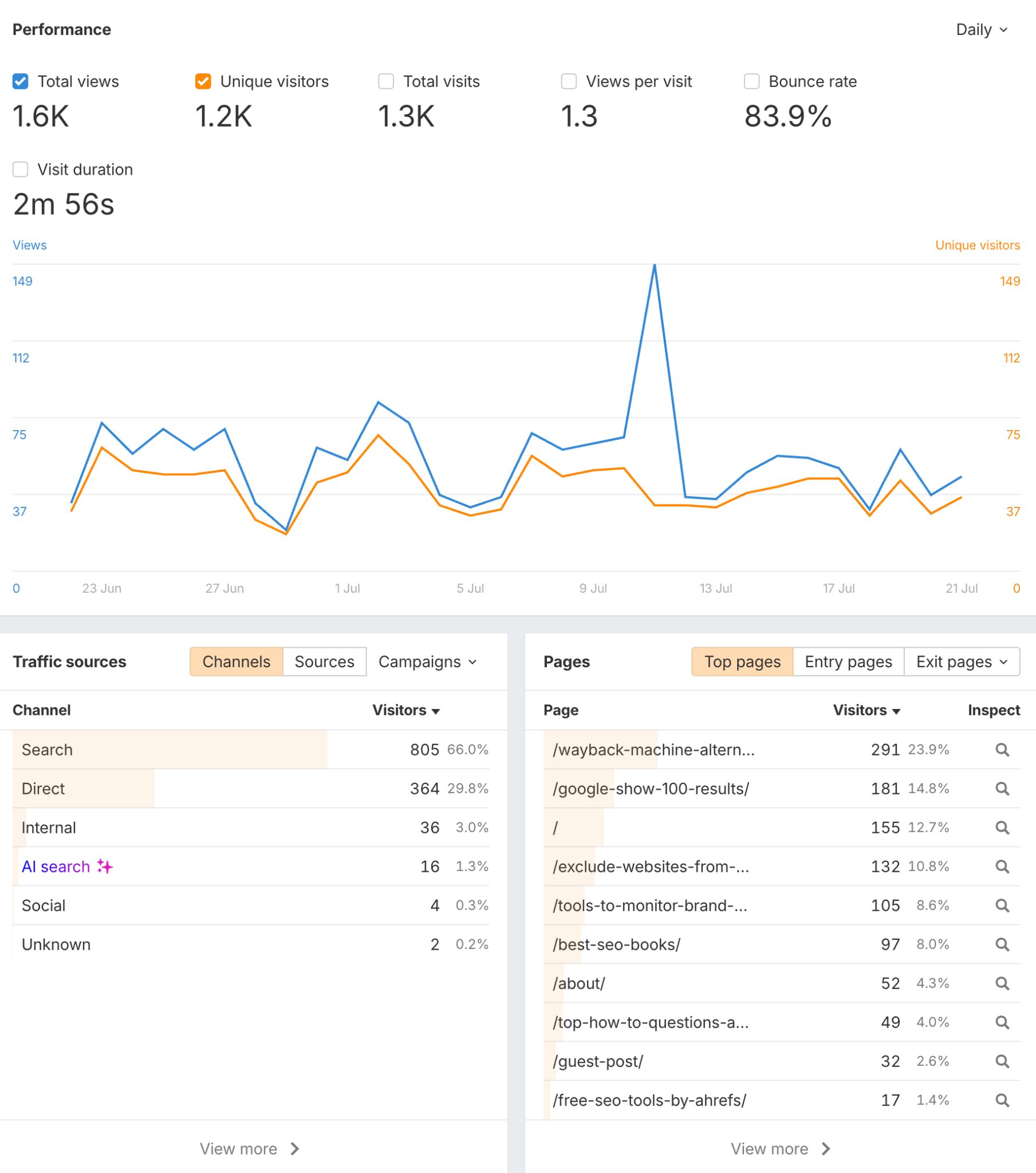 If you want something a little easier to use, you can try Ahrefs Web Analytics. It’s a simple-to-use, privacy-focused GA4 alternative that filters out bots, makes it easy to spot traffic from AI assistants, and is free up to 1 million events per month.